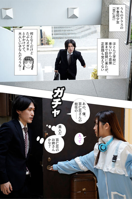 俺が担任しているクラスの不登校少女‘百仁花’。ほとんど学校に来ないから直接家まで訪問に来たが、正直顔も覚えてない。何となくだけどたぶんメガネとかかけてて、大人しい子なんだろう…と思っていた。インターホンを鳴らすと美女が玄関に現れた。お姉さんかな?などと思っていると、めちゃくちゃ結局的なヤリ手で、あれよあれよという間に流されて生で挿入してしまった。「こ、こんな姿、百仁花さんに見られたら…」「え?私が百仁花だけど?w」俺は教師という立場でありながら、知らぬ間に生徒と性交という御法度を破いてしまった。動画で脅されるし、俺の人生これからどうなってしまうんだ…。